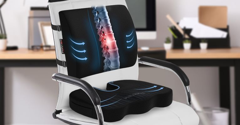 Using a seat and lumbar pillow in the office offers ergonomic support, promoting a healthier posture and reducing the risk of back pain or discomfort during prolonged sitting periods.
